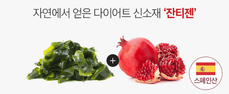 잔티젠은 미역과 석류에서 추출할 수 있는 아주 소량의 귀한 성분을 토대로 만든 성분으로 장기간 섭취를 하여도 안전하다는 결과가 있으며, 이는 체지방 감소에 도움을 준다고 합니다.