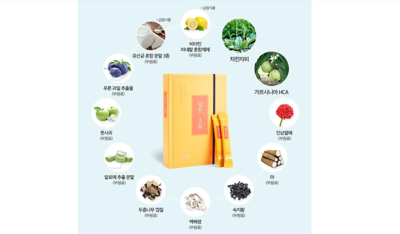 딥트3일의 주원료로는 가르시니아와 차전자피가 있습니다. 이 외, 체지방 감소에 도움을 주는 미강, L-카르니틴, 그린 커피 빈 추출 분말 등 총 13가지 성분으로 다양하게 구성되어 있는 건강기능식품입니다.