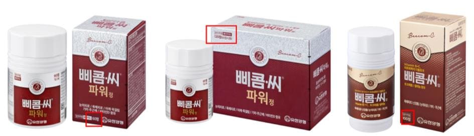 위 사진과 같이 왼쪽의 소박스 1통(60정) x 2개가 사진 중간의 대 박스(120정)에 들어가 있습니다. 참고로 삐콤씨정은 사진 오른쪽 소박스 1통(100정)으로 되어 있습니다.